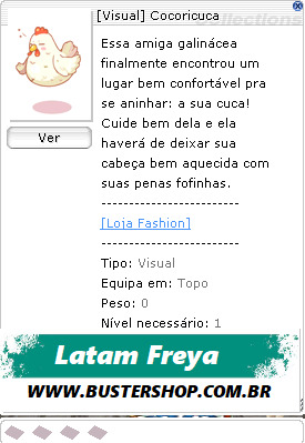 Essa amiga galinácea finalmente encontrou um lugar bem confortável pra se aninhar: a sua cuca! Cuide bem dela e ela haverá de deixar sua cabeça bem aquecida com suas penas fofinhas. Tipo: Visual Defesa: 0 Equipa em: Topo Peso: 0 Nível Necessário: 1 Classes: Todas