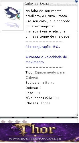 Na falta de seu manto predileto, a Bruxa Jiranto usa seu colar, que concede poderes mágicos inimagináveis e adiciona um leve toque de maldade. -------------------------- Pós-conjuração -5%. -------------------------- Aumenta a velocidade de movimento. -------------------------- Tipo: Equipamento para Cabeça Equipa em: Baixo Defesa: 0 Peso: 10 Nível necessário: 90 Classes: Todas