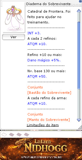 Nv. base 130 ou mais: ATQM +50. -------------------------- Conjunto [Cajado do Sobrevivente] A cada refino da arma: ATQM +10. -------------------------- Conjunto [Manto do Sobrevivente] A cada 2 refinos da capa: Conjuração variável -5%. --------------------------