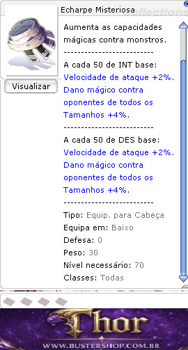 Aperfeiçoa as capacidades motoras e aquece o pescoço de maneira formidável. Aumenta as capacidades mágicas contra monstros.