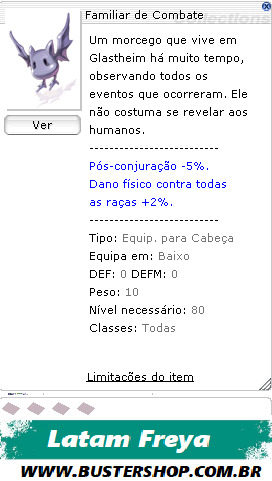 Tudo começou quando um sombrio Caçador da família Belo Monte, chamado Ricardo, resolveu que ia dedicar sua vida à caçar os seres da noite. Para isso dar certo, no lugar de treinar um falcão, ele escolheu treinar um Familiar, já que só iria se aventurar à noite. A ideia parece ter dado certo, já que hoje em dia é comum as pessoas andarem com familiars de combate adestrados como o seu amiguinho aqui. Pós-conjuração -5%. Dano físico contra todas as raças +2%. Tipo:Equip. para Cabeça Equipa em:Baixo Defesa:0 Peso:10 Nível necessário:80 Classes:Todas
