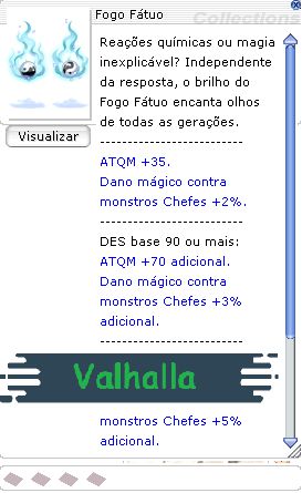 Reações químicas ou magia inexplicável? Independente da resposta, o brilho do Fogo Fátuo encanta olhos de todas as gerações. -------------------------- ATQM +35. Dano mágico contra monstros Chefes +2%. -------------------------- DES base 90 ou mais: ATQM +70 adicional. Dano mágico contra monstros Chefes +3% adicional. -------------------------- DES base 125 ou mais: ATQM +140 adicional. Dano mágico contra monstros Chefes +5% adicional. -------------------------- Tipo: Equip. para Cabeça Equipa em: Meio DEF: 0 DEFM: 0 Peso: 20 Nível necessário: 100 Classes: Todas