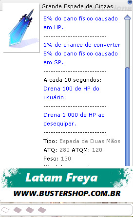 A cada 10 segundos: Drena 100 de HP do usuário. -------------------------- Drena 1.000 de HP ao desequipar. --------------------------