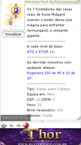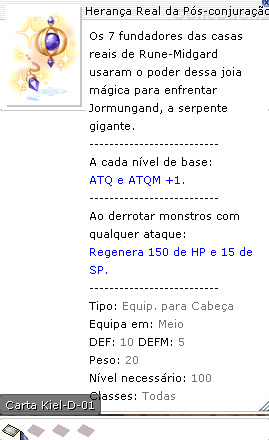 Os 7 fundadores das casas reais de Rune-Midgard usaram o poder dessa joia mágica para enfrentar Jormungand, a serpente gigante. -------------------------- A cada nível de base: ATQ e ATQM +1. -------------------------- Ao derrotar monstros com qualquer ataque: Regenera 150 de HP e 15 de SP. -------------------------- Tipo: Equip. para Cabeça Equipa em: Meio DEF: 10 DEFM: 5 Peso: 20 Nível necessário: 100 Classes: Todas