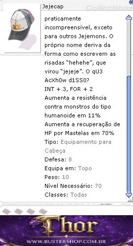 Um boné das Filipinas que virou marca da 'tribo dos Jejemons', um estranho grupo social que criou uma nova forma de internetês. No lugar de simplesmente abreviarem as palavras (ou escreverem errado), eles substituem letras de forma a deixar o texto praticamente incompreensível, exceto para outros Jejemons. O próprio nome deriva da forma como escrevem as risadas 'hehehe', que virou 'jejeje'. O qU3 AcXh0w d1SS0?