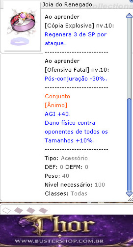 Uma joia que esconde promessas feitas por todos os Renegados que a usaram. Os mistérios do anel serão um dia revelados? -------------------------- FOR +7. -------------------------- Dano físico +10%. -------------------------- A cada 3 níveis de base: Dano de [Acerto de Contas] +1%. -------------------------- Ao aprender [Escapar] nv.5: Recarga de [Escapar] -0,5 segundos. -------------------------- Conjunto [Ânimo] AGI +40. Dano físico contra oponentes de todos os Tamanhos +10%. -------------------------- Tipo: Acessório DEF: 0 DEFM: 0 Peso: 40 Nível necessário: 100 Classes: Todas
