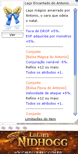 -------------------------- Taxa de DROP +5%. EXP adquirida por monstros +5%. -------------------------- Conjunto [Bolsa Mágica do Antonio] Conjuração variável -5%. Refino +12 ou mais: Todos os atributos +1. -------------------------- Conjunto [Bolsa Física do Antonio] Velocidade de ataque +5%. Refino +12 ou mais: Todos os atributos +1. -------------------------- Conjunto [Bolsa Certeira do Antonio] ATQ da arma +4%. Refino +12 ou mais: Todos os atributos +1. --------------------------