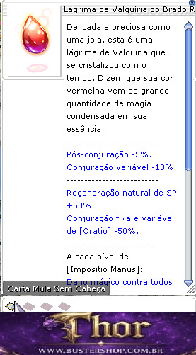 Delicada e preciosa como uma joia, esta é uma lágrima de Valquíria que se cristalizou com o tempo. Dizem que sua cor vermelha vem da grande quantidade de magia condensada em sua essência. Pós-conjuração -5%. Conjuração variável -10%. Regeneração natural de SP +50%. Conjuração variável de [Oratio] -50%.