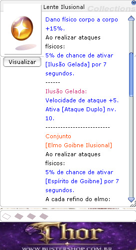 Conjunto [Barrete Ilusional]: ATQ da Arma +10%. Dano físico corpo a corpo +15%. Ao realizar ataques físicos, 5% de chance de ativar [Ilusão Gelada] por 7 segundos.