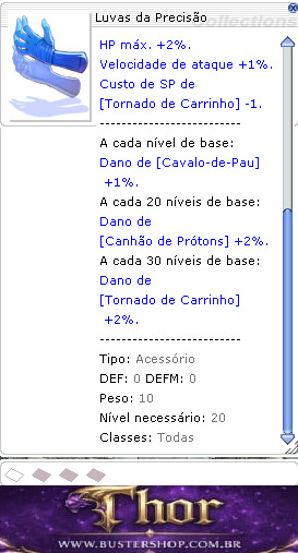 Cirúrgicas e firmes, as Luvas da Precisão dão conta de qualquer desafio que exija habilidades manuais. -------------------------- Precisão +20. Velocidade de ataque +5%. Recuperação de HP das Poções Vermelha, Laranja, Amarela e Branca +100%. -------------------------- A cada nível de [Aprimorar Carrinho]: ATQ +15. HP máx. +2%. Velocidade de ataque +1%. Custo de SP de [Tornado de Carrinho] -1. -------------------------- A cada nível de base: Dano de [Cavalo-de-Pau] +1%. A cada 20 níveis de base: Dano de [Canhão de Prótons] +2%. A cada 30 níveis de base: Dano de [Tornado de Carrinho] +2%. -------------------------- Tipo: Acessório DEF: 0 DEFM: 0 Peso: 10 Nível necessário: 20 Classes: Todas