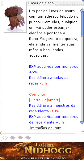 -------------------------- EXP adquirida por monstros +5%. Resistência a todas as raças-5%. -------------------------- Conjunto [Carta Gajomart] Resistência a monstros da raça Planta-10%. EXP adquirida por monstros da raça Planta +5%. -------------------------- Conjunto [Carta Gullinbursti] Resistência a monstros da raça Peixe-10%. EXP adquirida por monstros da raça Peixe +5%. -------------------------- Conjunto [Carta Diabinho] Resistência a monstros da raça Bruto-10%. EXP adquirida por monstros da raça Bruto +5%. -------------------------- Conjunto [Carta Esqueleto General] Resistência a monstros da raça Inseto-10%. EXP adquirida por monstros da raça Inseto +5%. -------------------------- Conjunto [Carta Mão de Ferro] Resistência a monstros da raça Amorfo-10%. EXP adquirida por monstros da raça Amorfo +5%. -------------------------- Conjunto [Carta Am Mut] Resistência a monstros da raça Humanoide-10%. EXP adquirida por monstros da raça Humanoide +5%. -------------------------- Conjunto [Carta Verme Ancião] Resistência a monstros da raça Demônio-10%. EXP adquirida por monstros da raça Demônio +5%. -------------------------- Conjunto [Carta Estrondo] Resistência a monstros da raça Dragão-10%. EXP adquirida por monstros da raça Dragão +5%.