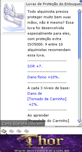 Todo alquimista precisa proteger muito bem suas mãos, não é mesmo? Essa luva foi desenvolvida especialmente para eles, com proteção extra ISO5000. 9 entre 10 alquimistas recomendam essa luva. -------------------------- SOR +7. -------------------------- Dano físico +10%. -------------------------- A cada 3 níveis de base: Dano de [Tornado de Carrinho] +2%. -------------------------- Ao aprender [Propulsão do Carrinho] nv.5: Velocidade de ataque +10%. Ao derrotar monstros com ataques físicos, regenera 100 de HP e 10 de SP. -------------------------- Ao aprender [Erva Daninha] nv.10: Precisão perfeita +15. -------------------------- A cada nível de [Catalisador Alquímico]: Dano físico contra todos os Tamanhos +2%. -------------------------- Conjunto [Delírio] Bioquímicos e evoluções: A cada nível de base, HP máx. +50. -------------------------- Tipo: Acessório DEF: 0 DEFM: 0 Peso: 10 Nível necessário: 100 Classes: Todas
