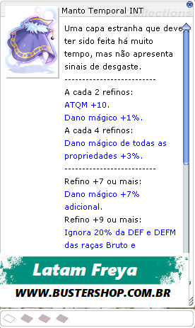 Embora o estilo desse manto e os símbolos nele inscritos sejam de outrora, ele, inexplicavelmente, não possui qualquer sinal de envelhecimento ou uso. Tão enigmática quanto a sua origem são as suas propriedades: ele parece possuir uma forte ligação arcana com Botas Temporais ou Botas Modificadas do mesmo tipo. -------------------------- A cada 2 refinos: ATQM +10. Dano mágico +1%. A cada 4 refinos: Dano mágico de todas as propriedades +3%. -------------------------- Refino +7 ou mais: Dano mágico +7% adicional. Refino +9 ou mais: Ignora 20% da DEF e DEFM das raças Bruto e Demônio. Refino +11 ou mais: Ignora +10% da DEF e DEFM das raças Bruto e Demônio adicional. -------------------------- Conjunto Botas Temporais INT [1] ou Botas Modificadas INT [1] ATQM +50. Botas com refino +10 ou mais: Ignora +30% da DEF e DEFM das raças Bruto e Demônio adicional. -------------------------- Tipo: Capa Defesa: 38 Peso: 40 Nível necessário: 100 Classes: Todas