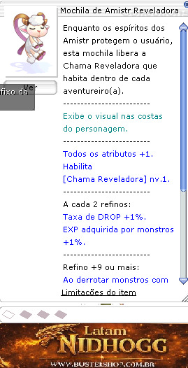 Enquanto os espíritos dos Amistr protegem o usuário, esta mochila libera a Chama Reveladora que habita dentro de cada aventureiro(a).