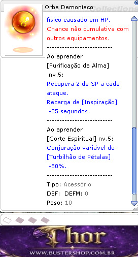 Esse orbe contém toda a força de um demônio. Encantamentos poderosos selam tudo que há de ruim nessa essência, mas mantêm (e até amplificam) o poder que ela oferece. -------------------------- FOR, AGI e VIT +5. Dano físico +5%. -------------------------- Ao aprender [Clone das Sombras] nv.5: A cada 4 níveis de base: Dano de [Turbilhão de Pétalas] +1%. Dano de [Arremessar Shuriken Huuma] +2%. -------------------------- Ao aprender [Assalto das Sombras] nv.5: Em [Turbilhão de Pétalas]: Custo de SP -10. Recarga -0,1 segundo. -------------------------- Ao aprender [Explosão de Moedas] nv.10: 100% de chance de converter 1% do dano físico causado em HP. Chance não cumulativa com outros equipamentos. -------------------------- Ao aprender [Purificação da Alma] nv.5: Recupera 2 de SP a cada ataque. Recarga de [Inspiração] -25 segundos. -------------------------- Ao aprender [Corte Espiritual] nv.5: Conjuração variável de [Turbilhão de Pétalas] -50%. -------------------------- Tipo: Acessório Defesa: 0 Peso: 10 Nível necessário: 100 Classes: Todas