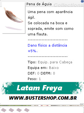 Tipo:Equip. para Cabeça Equipa em:Baixo DEF:0DEFM:0 Peso:1 Nível necessário:1 Classes:Todas