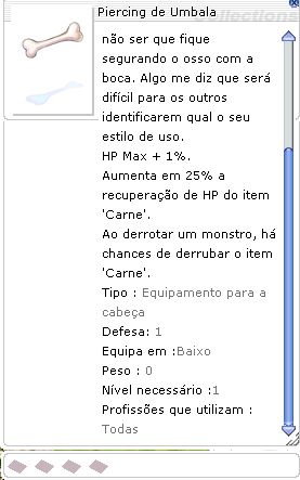 Um piercing popular entre a tribo de Umbala, dizem que é feito com um osso encantado de um grande carnívoro caçador. Com ele você finalmente poderá chamar a atenção dos outros para o seu nariz. A não ser que fique segurando o osso com a boca. Algo me diz que será difícil para os outros identificarem qual o seu estilo de uso.