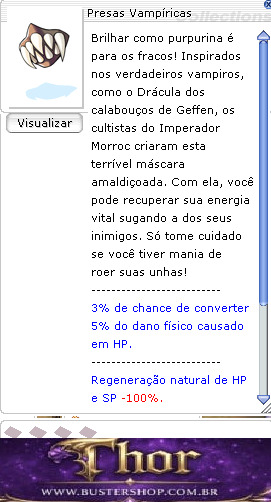 Brilhar como purpurina é para os fracos! Inspirados nos verdadeiros vampiros, como o Drácula dos calabouços de Geffen, os cultistas do Imperador Morroc criaram esta terrível máscara amaldiçoada. Com ela, você pode recuperar sua energia vital sugando a dos seus inimigos. Só tome cuidado se você tiver mania de roer suas unhas!