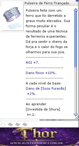 Pulsei feita com um ferro que foi derretido a graus muito elevados. Sua forma peculiar é o resultado de uma técnica de ferreiros experientes. Dá pra sentir o cheiro da forja e o calor do fogo se olharmos para sua joia. -------------------------- AGI +7. -------------------------- Dano físico +10%. -------------------------- A cada nível de base: Dano de [Soco Furacão] +2%. -------------------------- Ao aprender [Investida de Shura] nv.1: Dano físico contra todos os Tamanhos +10%. -------------------------- A cada nível de [Dragão Ascendente]: HP e SP máx. +2%. -------------------------- A cada nível de [Chakra da Fúria]: AGI +4. Esquiva +10. -------------------------- Tipo: Acessório DEF: 0 DEFM: 0 Peso: 40 Nível necessário: 100 Classes: Todas