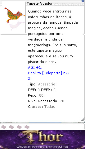 Quando você entrou nas catacumbas de Rachel à procura da famosa lâmpada mágica, acabou sendo perseguido por uma verdadeira onda de magmarings. Pra sua sorte, este tapete mágico apareceu e o salvou num piscar de olhos.