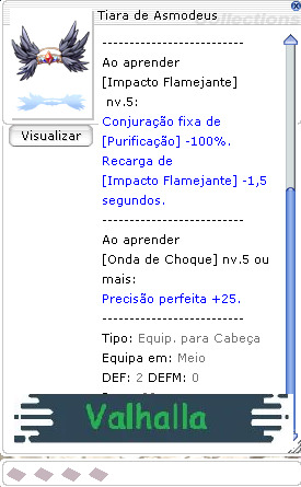 Uma tiara com as asas de asmodeus.Não da pra voar, mas elas te deixam poderoso ! -------------------------- Tolerância a Cegueira +100%. -------------------------- Resistência as raças Humano e Doram +5%. Dano físico contra todos os Tamanhos +10%. -------------------------- Ao aprender [Impacto Flamejante] nv.5: Conjuração fixa de [Purificação] -100%. Recarga de [Impacto Flamejante] -1,5 segundos. -------------------------- Ao aprender [Onda de Choque] nv.10: Precisão perfeita +25. -------------------------- Tipo: Equip. para Cabeça Equipa em: Meio DEF: 2 DEFM: 0 Peso: 30 Nível necessário: 100 Classes: Todas