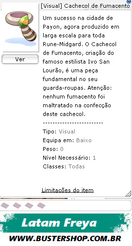Um sucesso na cidade de Payon, agora produzido em larga escala para toda Rune-Midgard. O Cachecol de Fumacento, criação do famoso estilista Ivo San Lourão, é uma peça fundamental no seu guarda-roupas. Atenção: nenhum fumacento foi maltratado na confecção deste cachecol.