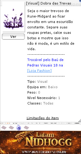 Seja o maior trevoso de Rune-Midgard ao ficar envolto em uma escuridão constante. Separe suas roupas pretas, calce suas botas e mostre que isso não é moda, é um estilo de vida.