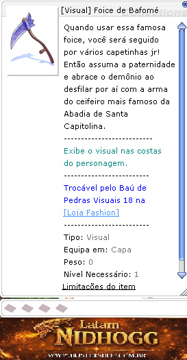 -------------------------- Exibe o visual nas costas do personagem. ------------------------- Trocável pelo Baú de Pedras Visuais 18 na[Loja Fashion]mal_in01,20,124,0,100,0,0
