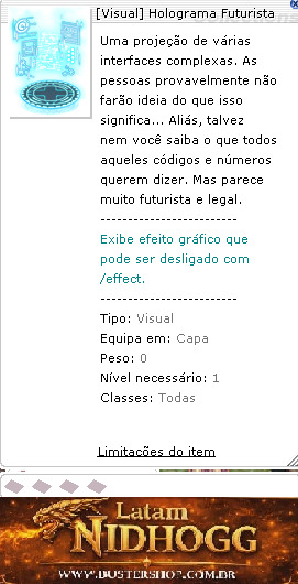 Tipo:Visual Equipa em:Capa Peso:0 Nível necessário:1 Classes:Todas