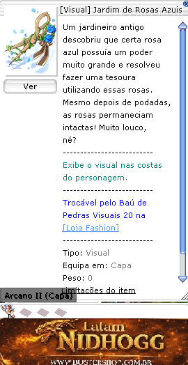 -------------------------- Exibe o visual nas costas do personagem. -------------------------- Trocável pelo Baú de Pedras Visuais 20 na[Loja Fashion]mal_in01,20,124,0,100,0,0